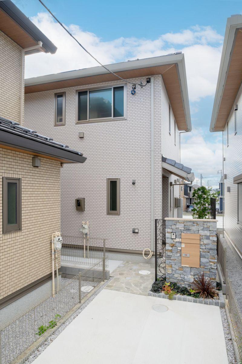 15区画の街に広がる、笑顔とつながり。子育てにも安心な、緑と調和した暮らしを。住まいの第一印象を上品に仕上げる門柱。素材の質感が際立ち、さりげなく格調を感じさせる佇まいです。