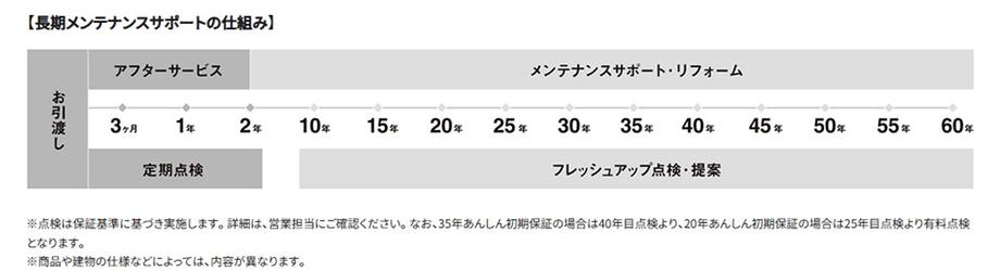 お引渡し後2年間は「アフターサービス」の期間とし、定期的にお住まいに関するアドバイスや時期に応じた点検・調整を行います。アフターサービス期間以降も、フレッシュアップ点検(最長60年目まで)