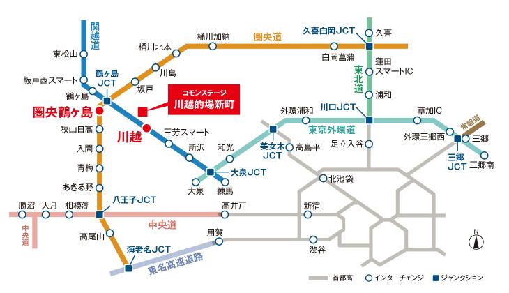 関越道「川越IC(約6080m)」と圏央道「圏央鶴ヶ島IC(約4450m)」から都心やリゾート地へスムーズにアクセスでき、休日のカーライフを楽しめます。