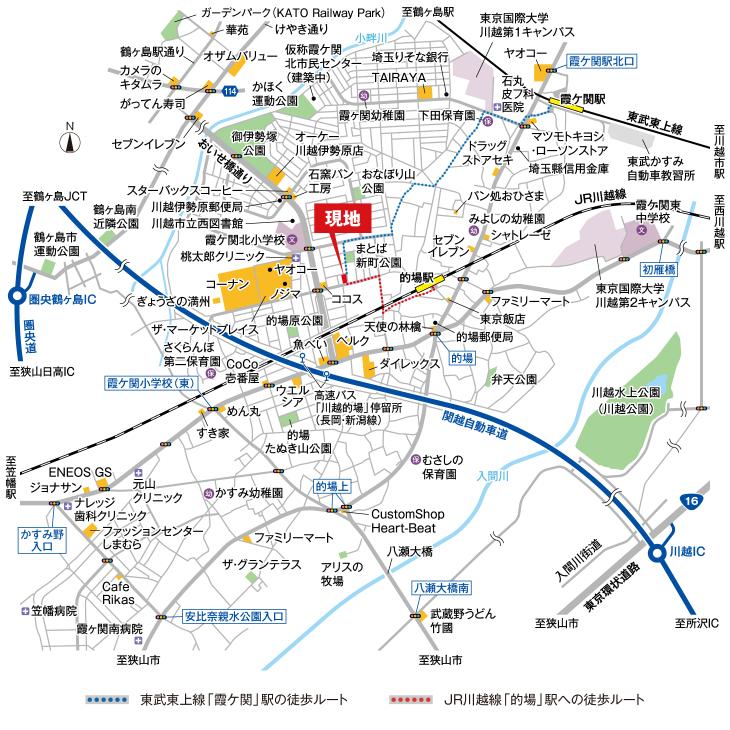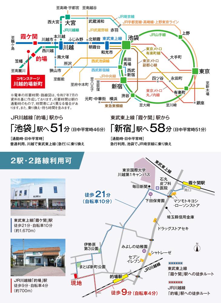 JR川越線「的場」駅と、東武東上線「霞ケ関」駅の2駅・2路線利用可。東武東上線は、東京メトロ副都心線・有楽町線直通の列車も利用でき、都心や横浜方面へ快適にアクセスしやすいポジションです。