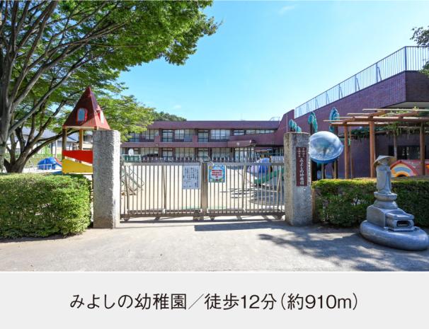 みよしの幼稚園まで910m 徒歩12分。武蔵野の面影を残し、四季折々に移り変わる自然に囲まれた、歴史の深い法城寺境内にある幼稚園です。