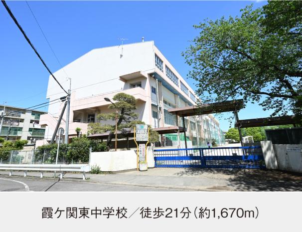霞ケ関東中学校まで1670m 徒歩21分。「自ら学ぶ、心身ともに、健やかな生徒」を学校教育目標に掲げる昭和52年開校の公立中学校です。
