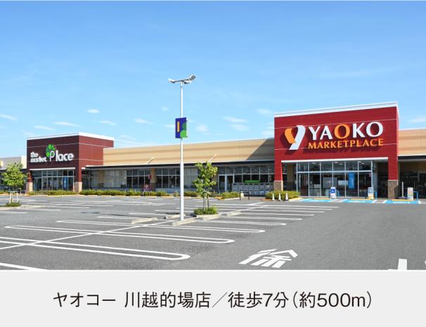 ヤオコー 川越的場店まで500m 徒歩7分。ショッピングセンター「ザ・マーケットプレイス川越的場」の敷地内にある食生活提案型スーパーマーケットです。ドラッグストアや家電量販店も揃う便利なお買い物施設です。