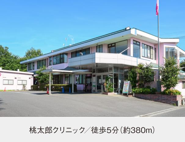 桃太郎クリニックまで380m 徒歩5分。診療科目:内科、小児科、小児心臓外来、アレルギー外来、発達外来。インターネット予約もできる便利なクリニック。