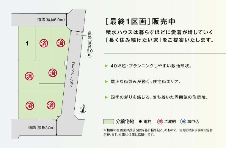 設備:○設備 電気:東京電力、ガス:都市ガス(角栄ガス)、上水道:公営水道、下水道:公共下水、雨水:宅内浸透式、開発許可番号:開発申請不要な土地のため無し、開発面積:1000㎡、○良好な住環境を保つために「コモンステージ川越的場新町まちなみガイドライン」がございます。○水道分担金等(税込):257400円(20mm) ○道路の幅員及び舗装:6.0m(アスファルト舗装)○景観法あり○都市再生特別措置法あり○確定測量後、土地面積が変更になる場合がございます○先着順受付中○お申込には印鑑(認印)と申込証拠金10万円が必要です。○本分譲地の土地売買契約は、契約締結後3ヶ月以内に売主である積水ハウス株式会社との間で建築工事請負契約が成立することを条件として効力を生じます。期限までに、建築工事請負契約が成立しなかったときは、土地売買契約の無効が確定し、受領済の手付金等は、全額無利息にてすみやかに返還いたします。