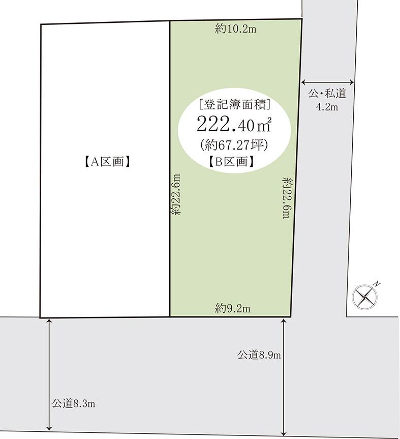 | 建ぺい率・容積率 | 60%・200% | 私道負担・道路 | 共有持分2.27㎡×(1/1)、南東8.3m幅(接道幅9.2m)、北東4.2m幅(接道幅22.6m) | ||