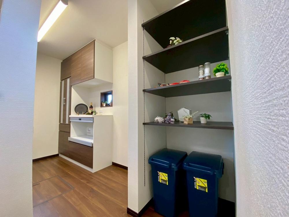 カップボード&パントリー(施工例)食器類や調理家電をキッチリ収納できるカップボードを標準装備。キッチン扉とお揃いカラー。食品の保管に役立つパントリーは、スペースを拡げたり扉付きにしたりもできます♪