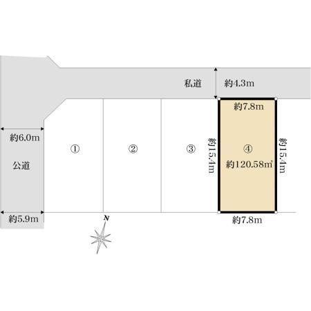 建ぺい率・容積率 | 60%・172% | 私道負担・道路 | 共有持分158㎡×(1/30)、北西4.3m幅 | ||