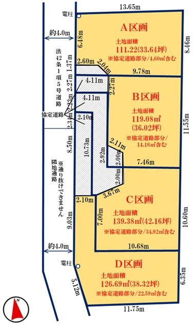建ぺい率・容積率 | 建ぺい率:60%、容積率:200% | 私道負担・道路 | 道路幅:4m、アスファルト舗装、協定道路/A区画:4.60㎡、B区画:14.06㎡ | ||