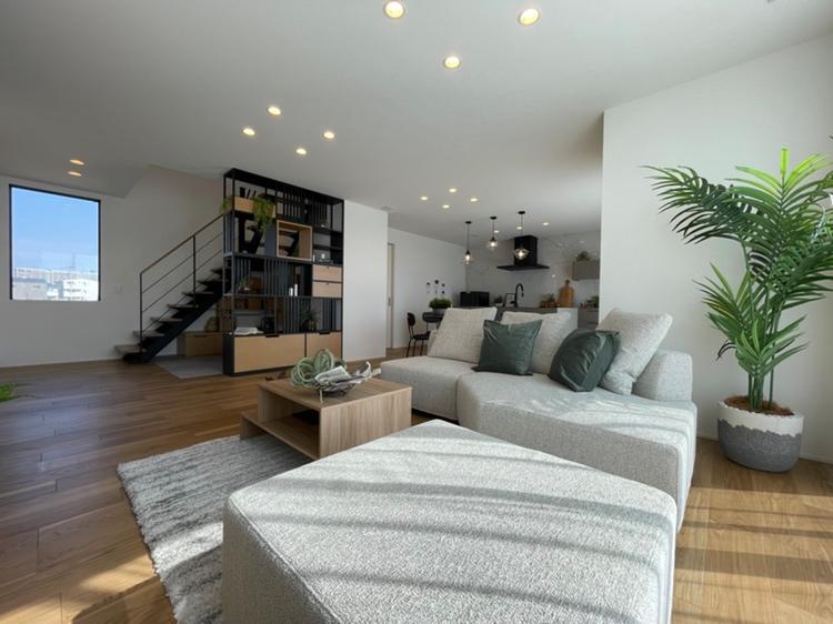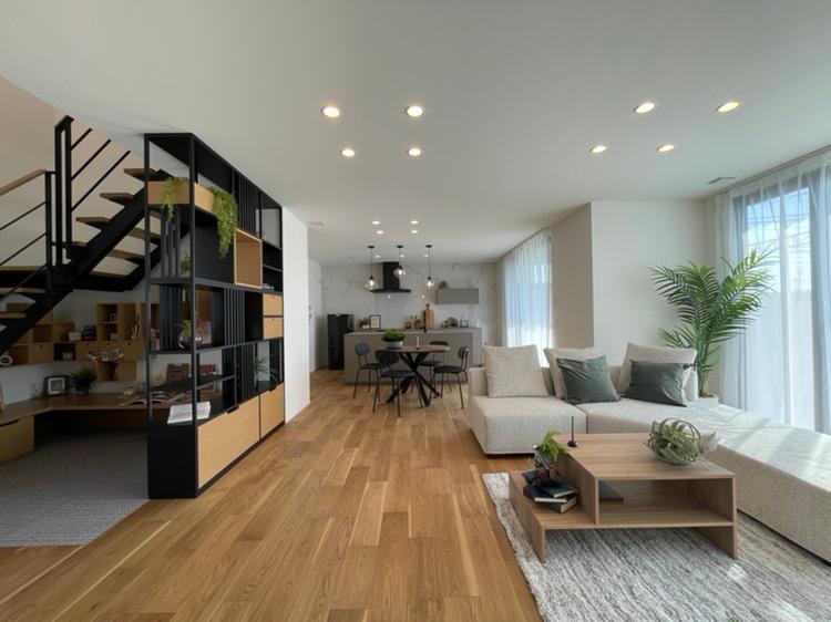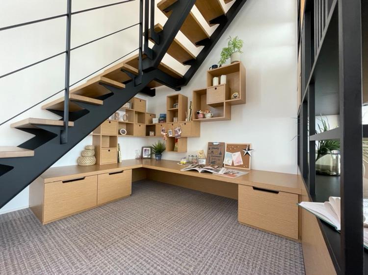 リビングをより開放的に、より広く見せるためにスケルトン階段を採用。下部はスタディコーナーにしています。お子様の遊び場、在宅ワークスペースとして利用いただけます。