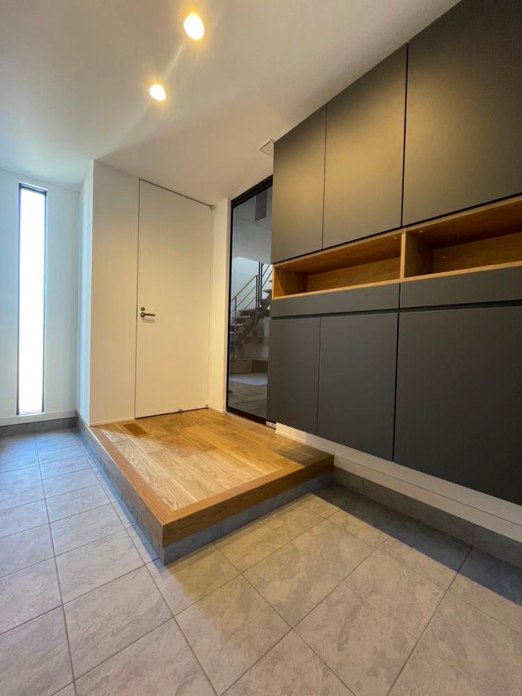 玄関はL型框によって奥行き感を演出。広々としたスペースでゆとりがうかがえます。