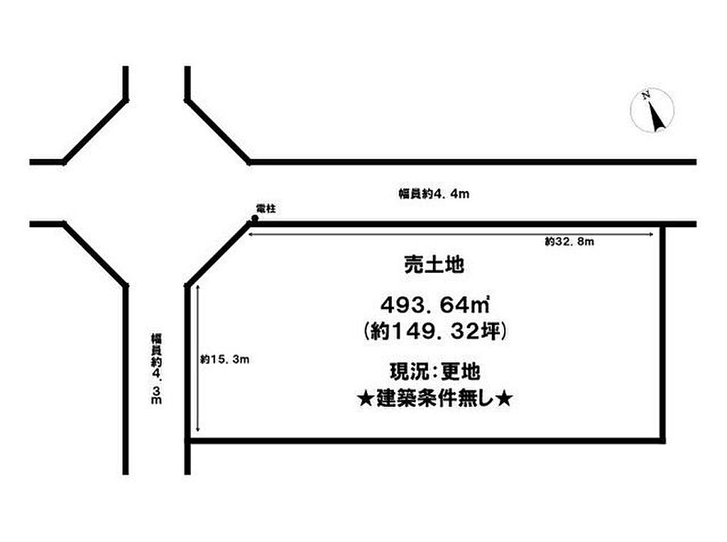 | セットバック | 無 | 接道状況 | 角地 ( 北東 4.4m 公道 間口32.8m ) ( 北西 4.3m 公道 間口15.3m ) | ||