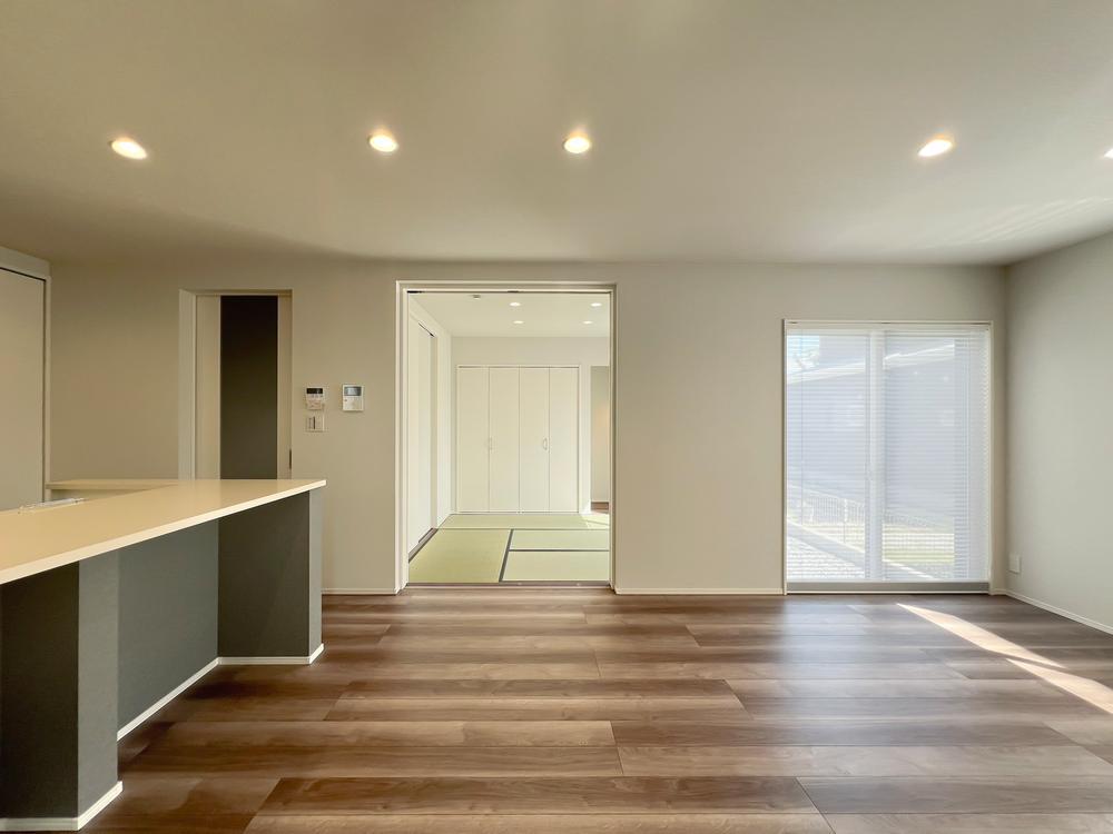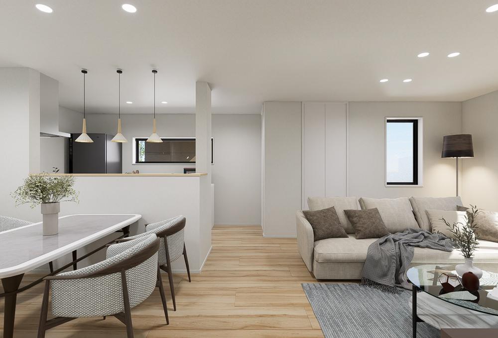 【LDKプラン例/敷島ステラ・大津 雄琴4丁目6号地コンセプトモデルハウス】キッチンからLDまで視界が抜ける、統一感のあるLDK設計。※CG画像の為、実際と多少異なることがございます。