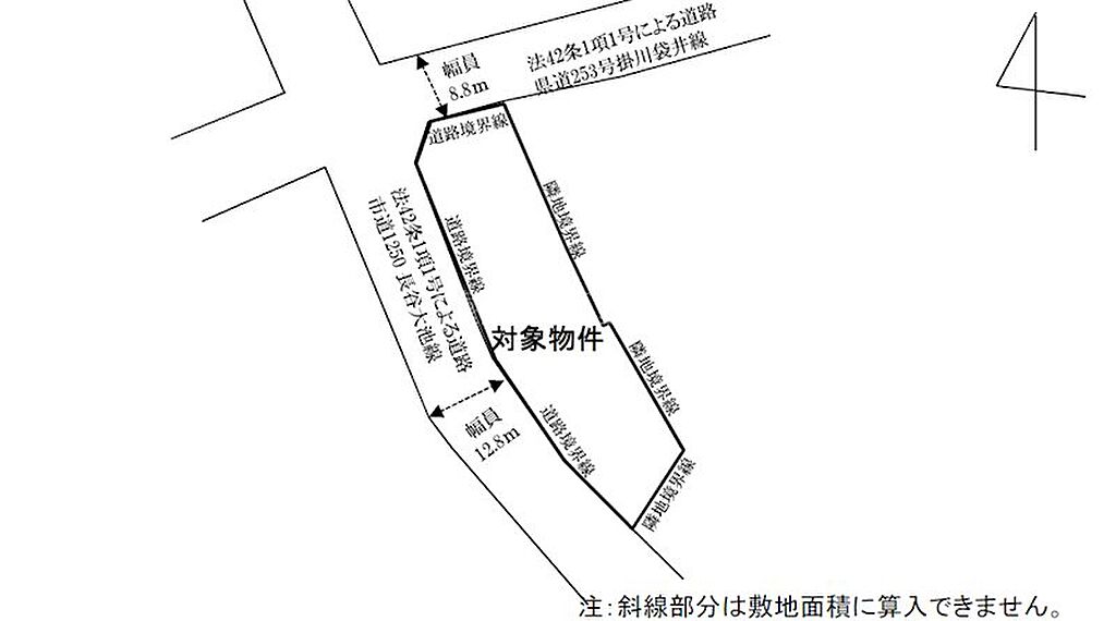 | セットバック | 無 | 接道状況 | 角地 ( 北 8.8m 公道 間口5m ) ( 南西 12.8m 公道 間口24.5m ) | ||