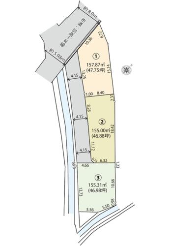 | 備考 | 建築条件無し、私道は②③にて共有、①通行地役権設定 ③がけ条例要検討 ②③3階建て要確認・私道負担:あり132.7平米(共有持分:1/2)・豊かな緑に彩られた閑静な住宅街。 / 条件等:現況渡し | ||||