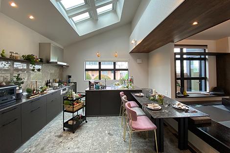 【小山展示場】建築面積:256,2平米(77,5坪)。天窓から降り注ぐ光が気持ち良いキッチンは、回遊性も取れた使い勝手の良い動線を実現。明るさ・空気環境・使い勝手・動線において快適なキッチンです。