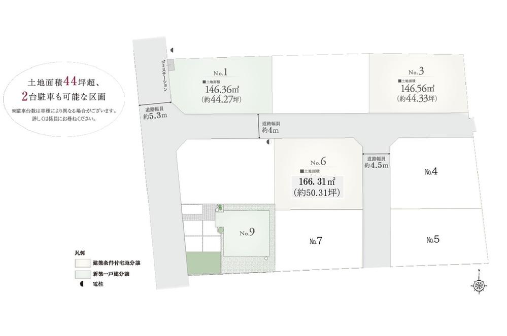| 建ぺい率・容積率 | 建ペい率:60%、容積率:200% | 私道負担・道路 | 道路幅:4m、アスファルト舗装、有り(有りの場合:私道負担面積197.71㎡※No.1~8のみ)ゴミステーション2.16㎡(No.1~9均等按分) | ||