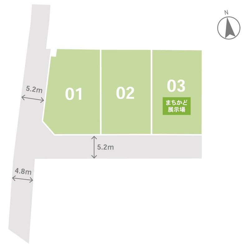 | 建ぺい率・容積率 | 建ぺい率60%、容積率200% | 私道負担・道路 | 道路幅:4.8m~5.2m、アスファルト舗装、西側:公道 約4.8m~5.2m、分譲地内開発道路 約5.2m | ||