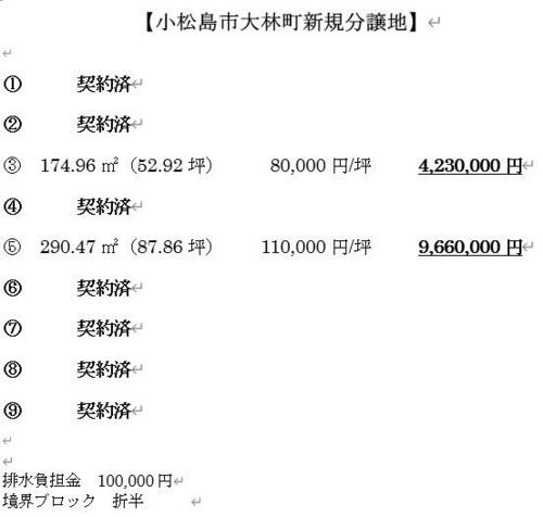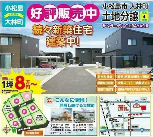 | 備考 | 排水負担金10万円・境界ブロック工事費用が必要です。・小松島市:大林町で新規分譲開始!残りの区画!お気軽にお問い合わせください。 / 条件等:現況渡し | ||||