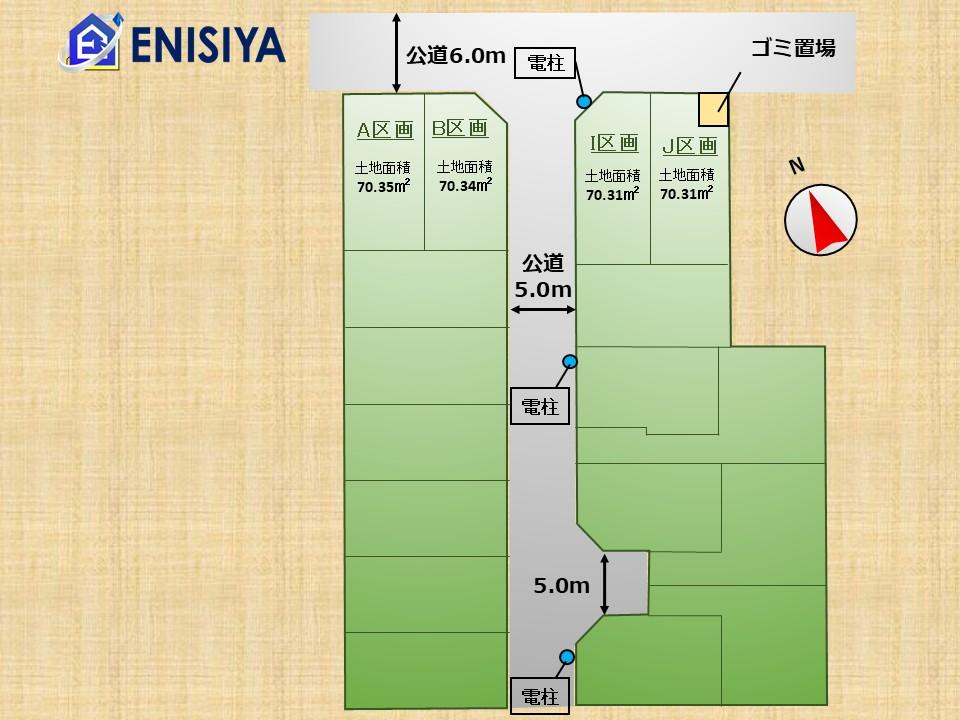 | 建ぺい率・容積率 | 建ペい率:60%、容積率:200% | 私道負担・道路 | 道路幅:5m~6m、アスファルト舗装、北側約6m公道、分譲地内約5m公道 | ||