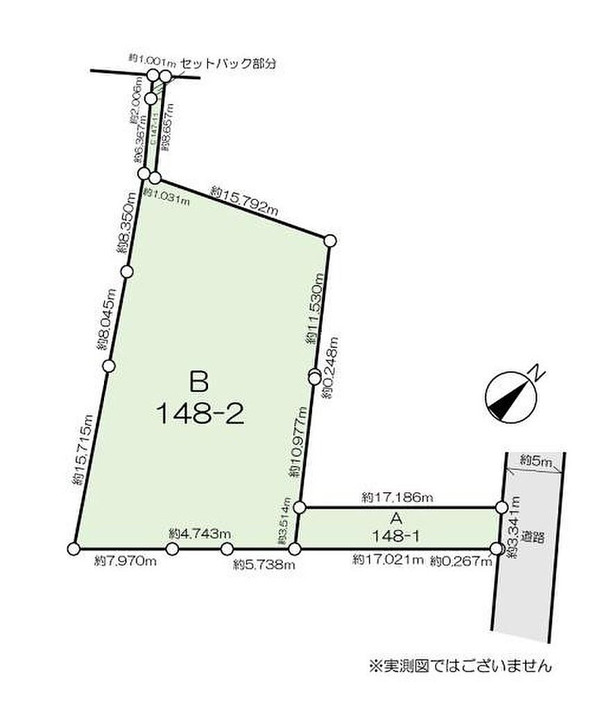 セットバック | 2㎡ | 接道状況 | 一方 ( 北東 5m 公道 間口3.3m ) ( 北西 4m 私道 間口1m ) | ||