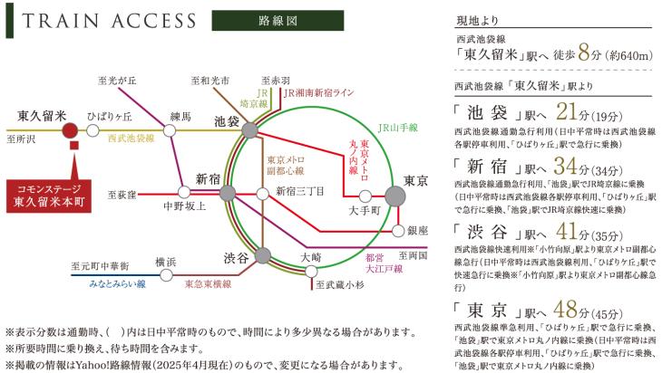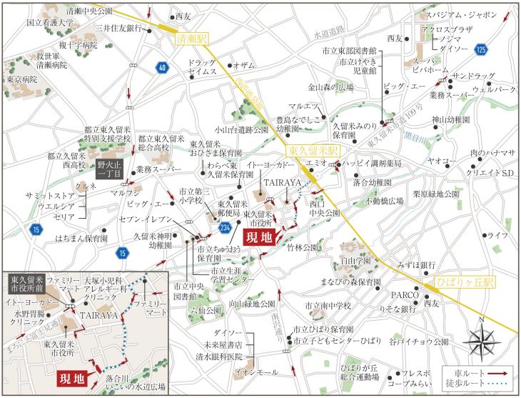 西武池袋線「東久留米」駅まで640m 徒歩8分。通勤急行や快速が停車するため、様々な都心の主要駅へ快適にアクセスできます。駅ナカ・コンビニはPASMOの利用が可能で、通勤・通学前のお買物がスムーズです。