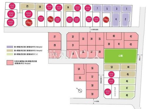 | 備考 | ※土地契約後3ヶ月以内に売主との建築請負契約締結を条件とし販売します。期間内に建築請負契約を締結されなかった場合、土地売買契約は白紙となり受領した手付金等の土地代金は全てお返しします。・第2期分譲開始!全59区画の大型分譲地です♪思い描いていた理想の家を、この土地で実現させてみませんか?多彩なバリエーションの間取りで、ご家族皆様のライフスタイルに合った邸宅がきっと見つかると思います。・【現地販売会】2026/2/21~3/1(11:00~17:00)★☆予約制見学会開催!事前に必ずお問い合わせください☆★ | ||||