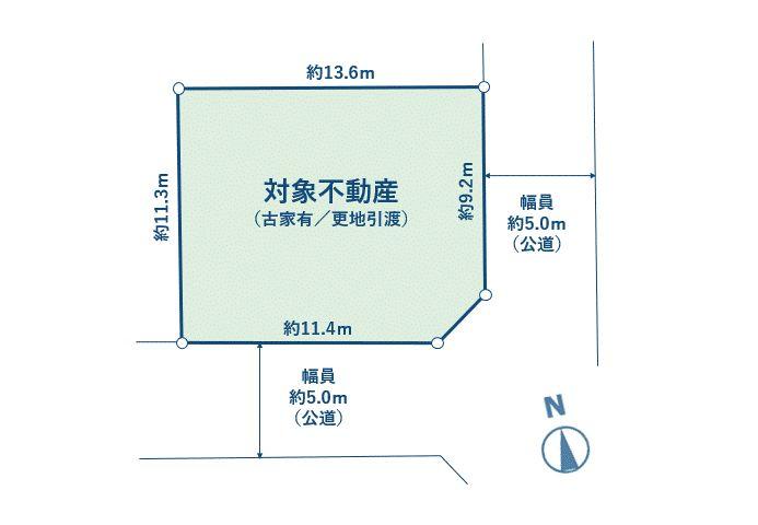 | 建ぺい率・容積率 | 50%・80% | 私道負担・道路 | 無、南5m幅(接道幅11.4m)、東5m幅(接道幅9.2m) | ||