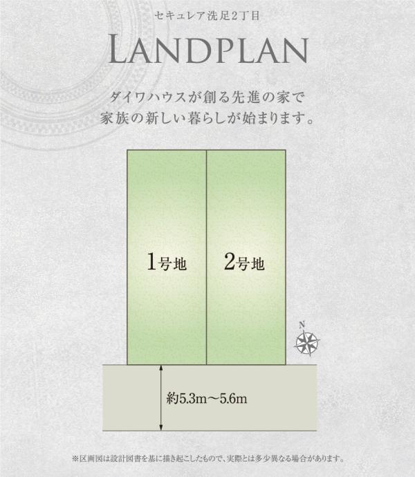 | 建ぺい率・容積率 | 50%・100% | 私道負担・道路 | 道路幅:5.3m~5.6m、アスファルト舗装、(1号地)、(2号地) 全て私道負担なし | ||