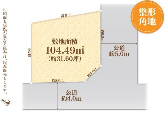 | 建ぺい率・容積率 | 40%・80% | 私道負担・道路 | 無、南東5m幅(接道幅9.5m)、南西4m幅(接道幅8m) | ||
