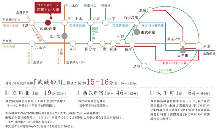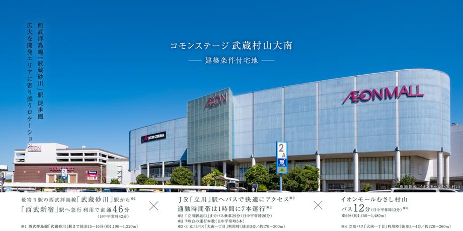 西武拝島線「武蔵砂川」駅まで徒歩15~16分。「西武新宿」駅へ急行利用で46分のダイレクトアクセス。 隣駅の「玉川上水」駅から多摩モノレールを利用すると、立川方面への移動もスムーズです。