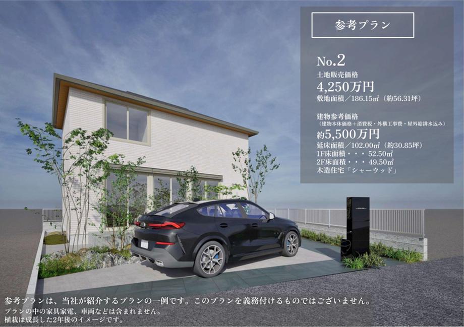 【No.2参考プラン/外観パース】土地価格/4250万円、敷地面積/186.15㎡(約56.31坪)。床面積/1階52.50㎡・2階49.50㎡、延床面積/102.00㎡(約30.85坪)。