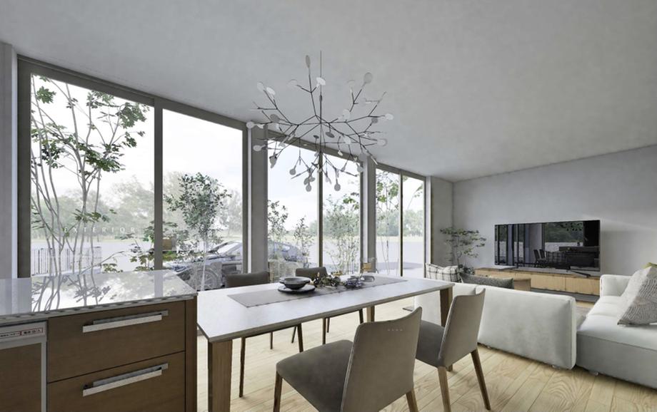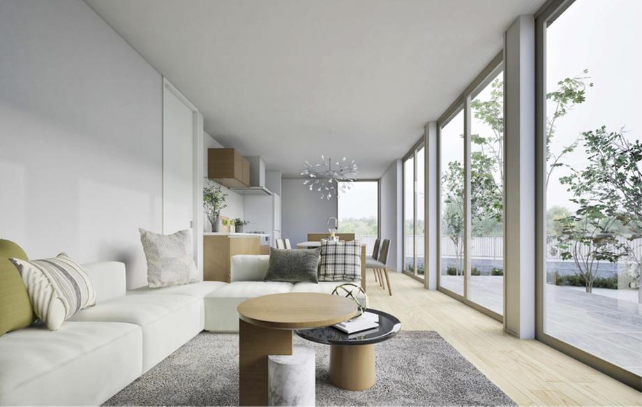 【No.2参考プラン/LDK内観パース】プラン中の家具家電・車両などは参考価格に含まれません。また、植栽は成長した2年後のイメージです。