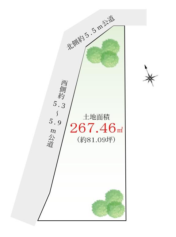 建ぺい率・容積率 | 60%・200% | 私道負担・道路 | 無、西5m幅(接道幅5.3m)、北5.5m幅(接道幅4m) | ||
