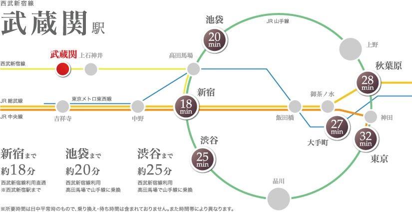 武蔵関駅まで1110m 西武新宿線終点駅「西武新宿駅」まで準急19分と都心への利便が便利。スーパーマーケットや雑貨・食材・レストランなどの多彩な店舗が充実している。昔ながらの暮らしやすさが広がる人気エリア