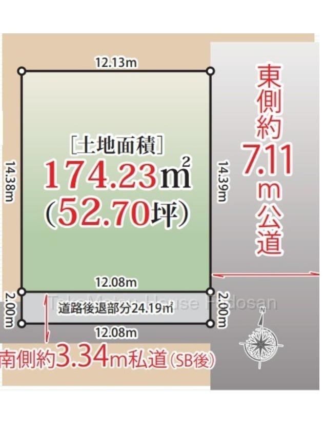 | 建ぺい率・容積率 | 50%・100% | 私道負担・道路 | 共有持分24.19㎡×(1/1)、東7.1m幅(接道幅14.3m)、南3.3m幅(接道幅12m) | ||