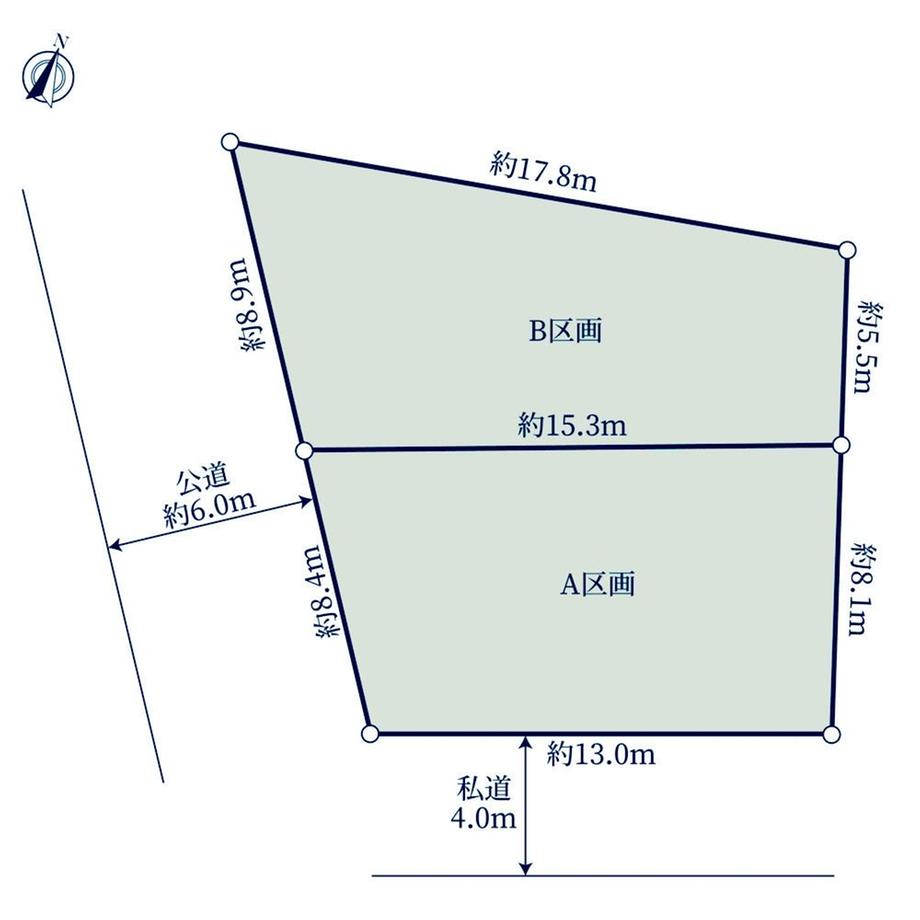 | 建ぺい率・容積率 | 50%・100% | 私道負担・道路 | 無、南西6m幅(接道幅8.4m)、南東4m幅(接道幅13m) | ||