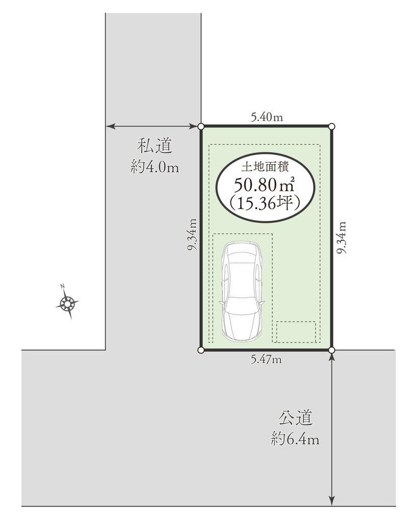 | 建ぺい率・容積率 | 70%・200% | 私道負担・道路 | 共有持分93.69㎡×(5846/74952)、南6.4m幅、西4m幅 | ||