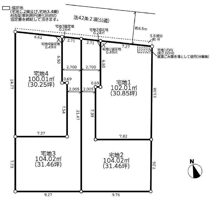 その他制限事項 | 高度地区、準防火地域、第一種高度地区、要土地先行決済となります。SB部分(約10.87㎡)は分筆後市に移管予定です。協定地(宅地1、2間及び、宅地3、4)間相互駐車場利用円滑化目的の協定書を締結していただきます。宅地1の内(約2.00㎡)資源ごみ置き場として使用(分筆無) | ||||