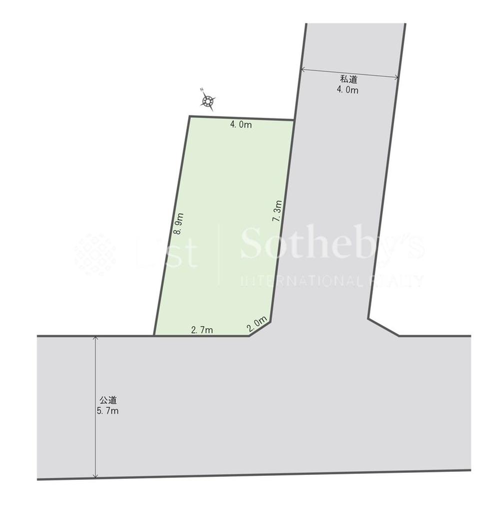 | 建ぺい率・容積率 | 60%・200% | 私道負担・道路 | 無、南西5.7m幅(接道幅2.7m)、東4m幅(接道幅7.3m) | ||
