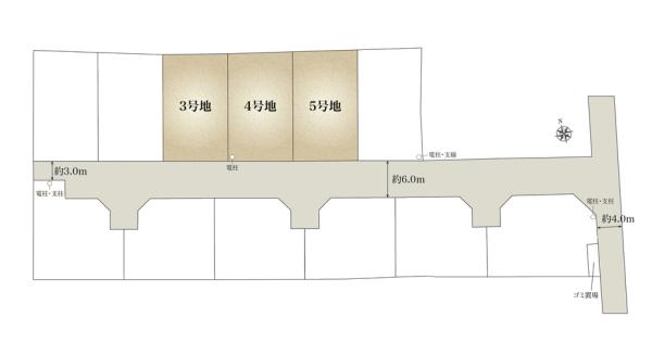 | 建ぺい率・容積率 | 60%・200% | 私道負担・道路 | 道路幅:6m、アスファルト舗装、(3号地)、(4号地)、(5号地) 私道負担なし | ||