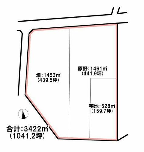 | 備考 | ・当該土地は3筆になります 282番4 宅地:528m2 282番3 原野:1461m2 282番1 畑:1453m2・自然公園法:普通地域・私道負担:なし / 条件等:現況渡し | ||||